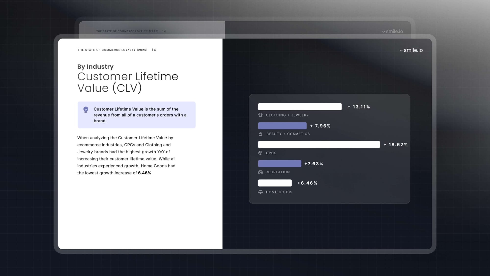 - When analyzing the Customer Lifetime Value by ecommerce industries, CPGs and Clothing and Jewelry brands had the highest growth YoY in customer lifetime value. While all industries experienced growth, Home Goods had the lowest growth increase of 6.46%.