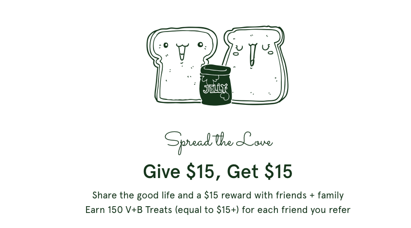 With dollars off rewards, value is very clearly communicated and easy to understand: my friend gets $5 off his first purchase and I get $5 off my next purchase. Vegetable and Butcher’s “Give $15, Get $15” referral program gets new customers to try out their meal subscription service at a discounted cost. With that $15 in hand, new customers feel more comfortable trying the brand for the first time, pushing them to make a first purchase that ultimately increases the likelihood they will become a long term customer.
