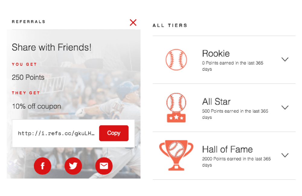 With both a VIP program, points program, and referrals, Topps offers 250 points to the sender and 10% off their order to the receiver. 250 points carries a high value in this particular rewards program because it helps you reach the “All-Star” tier, unlocking exciting new rewards and benefits! These exclusive perks include a free “Topps Now” baseball card of the month - a reward that is perfectly catered to Topps’ sports-loving brand loyalists.