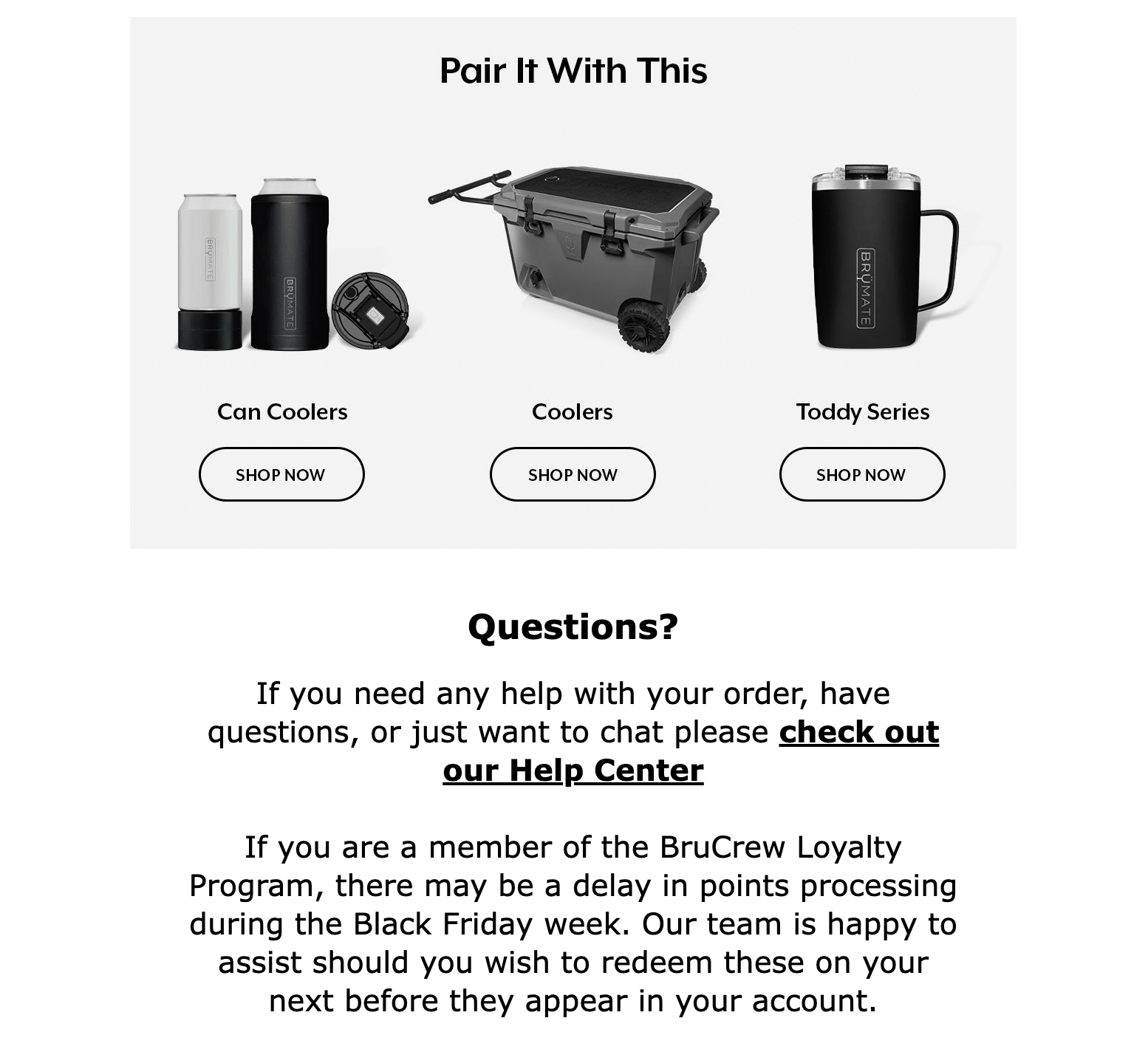 The other option is to only set up a few cross-sell recommendations for your best sellers and use personalized product recommendations for purchasers of other products. BrüMate does a good job at recommending products that pair well with a customer’s recent purchase. This cross-sell campaign can increase the AOV of a customer and get them to come back for a repeat purchase. Not only is the email branded, but it’s also working hard to get customers to come back for more.