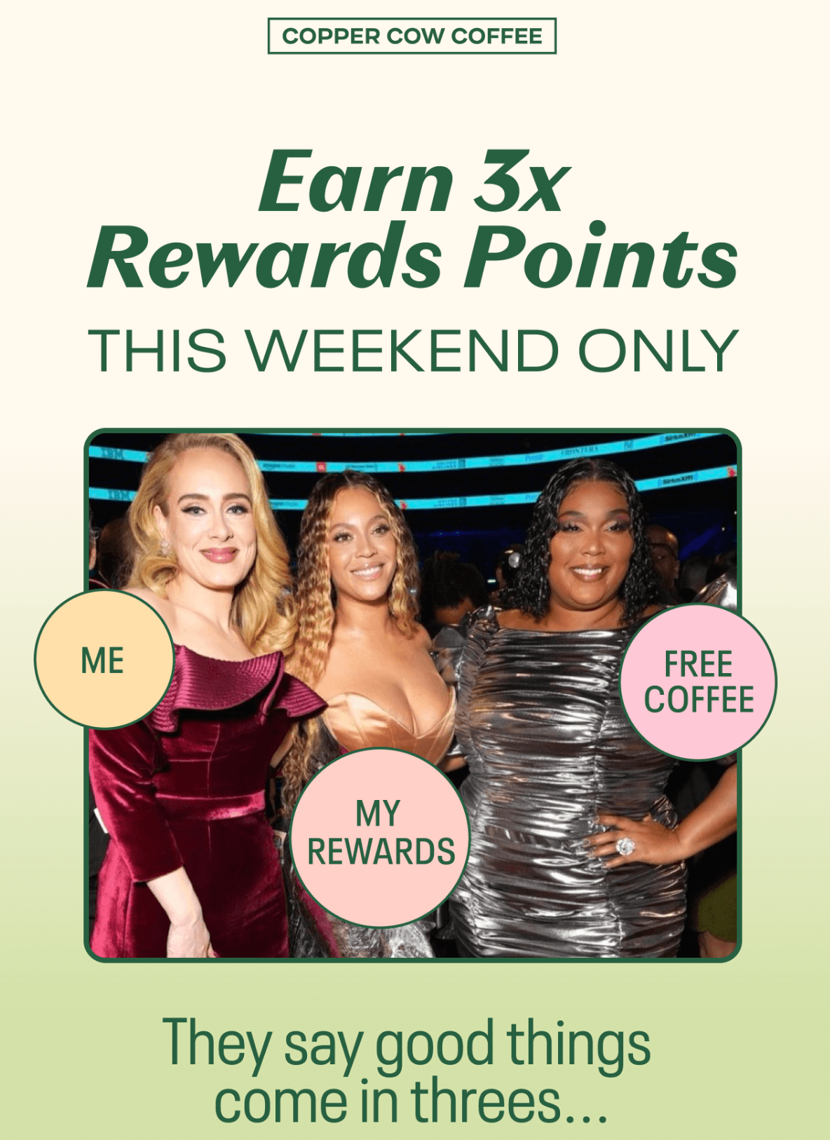 Specialty Vietnamese coffee brand, Copper Cow Coffee promotes its triple points weekend offering 3x the points on all orders. They emphasize how members can redeem rewards with just as little as 75 points for free products.