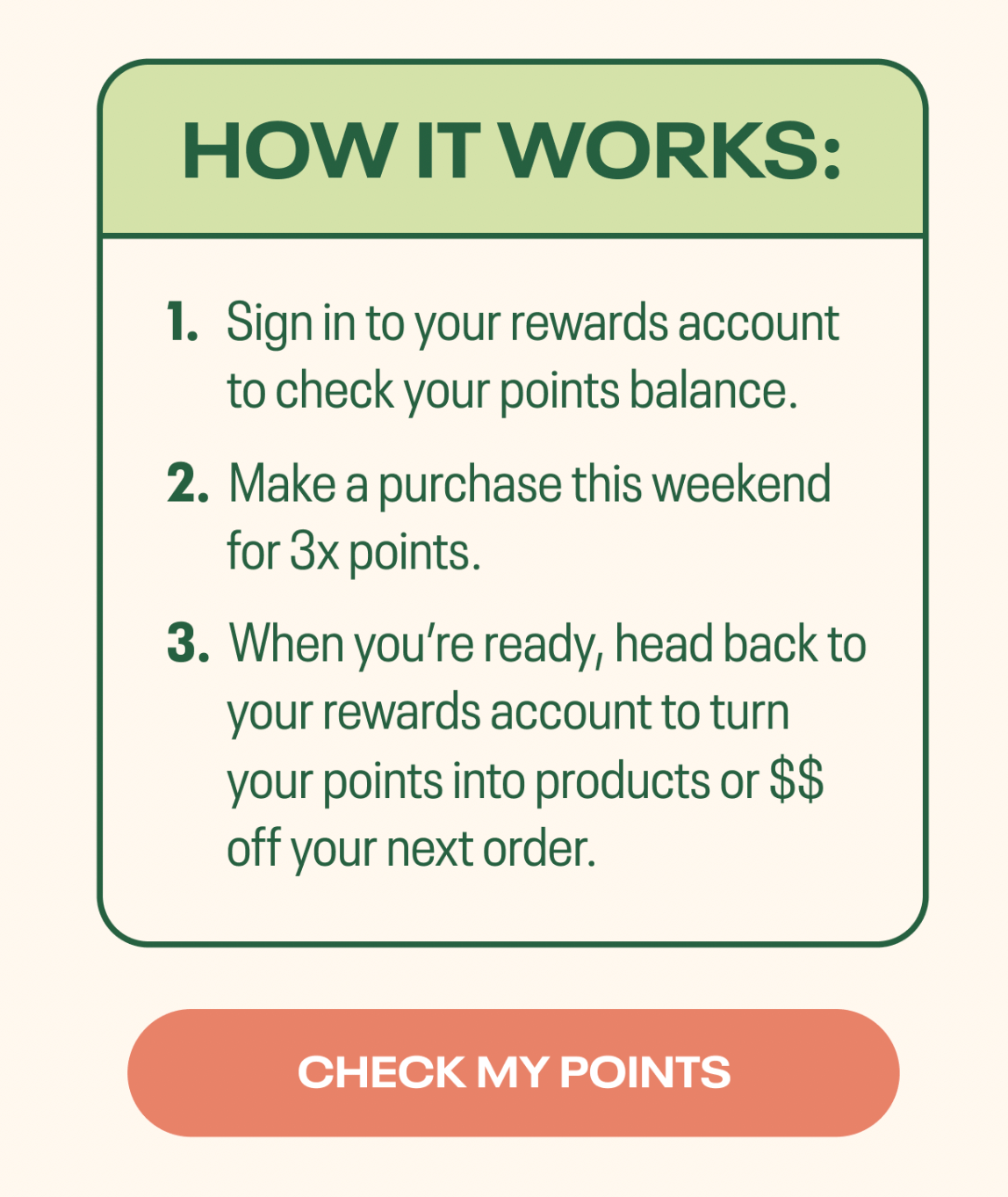 Their email primes customers to return for a repeat purchase. Emphasizing that their next reward is their next pack of creamers, coffee, and lattes. They end with an actionable CTA– “Check My Points.”